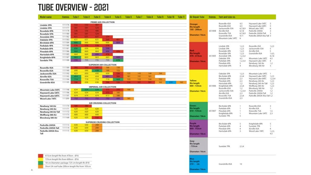 Please view the images on this listing which show a series of coloured charts produced by Outwell over the years. These detail that year’s production of tents and the correct replacement beams for each model of tent.